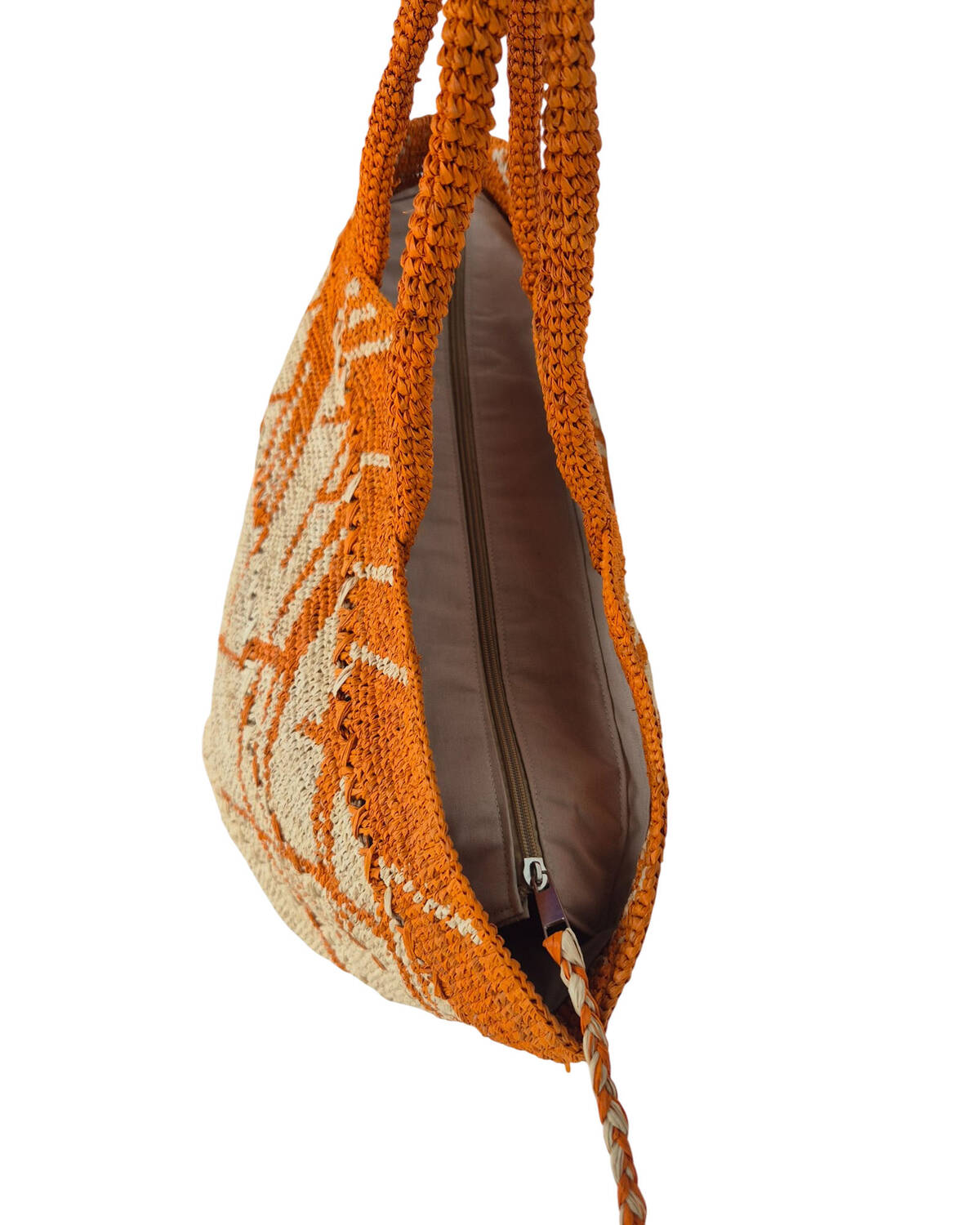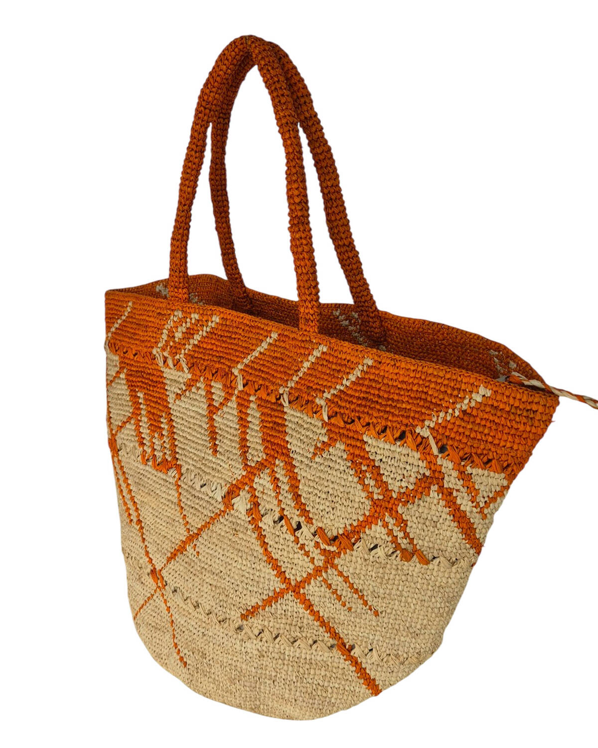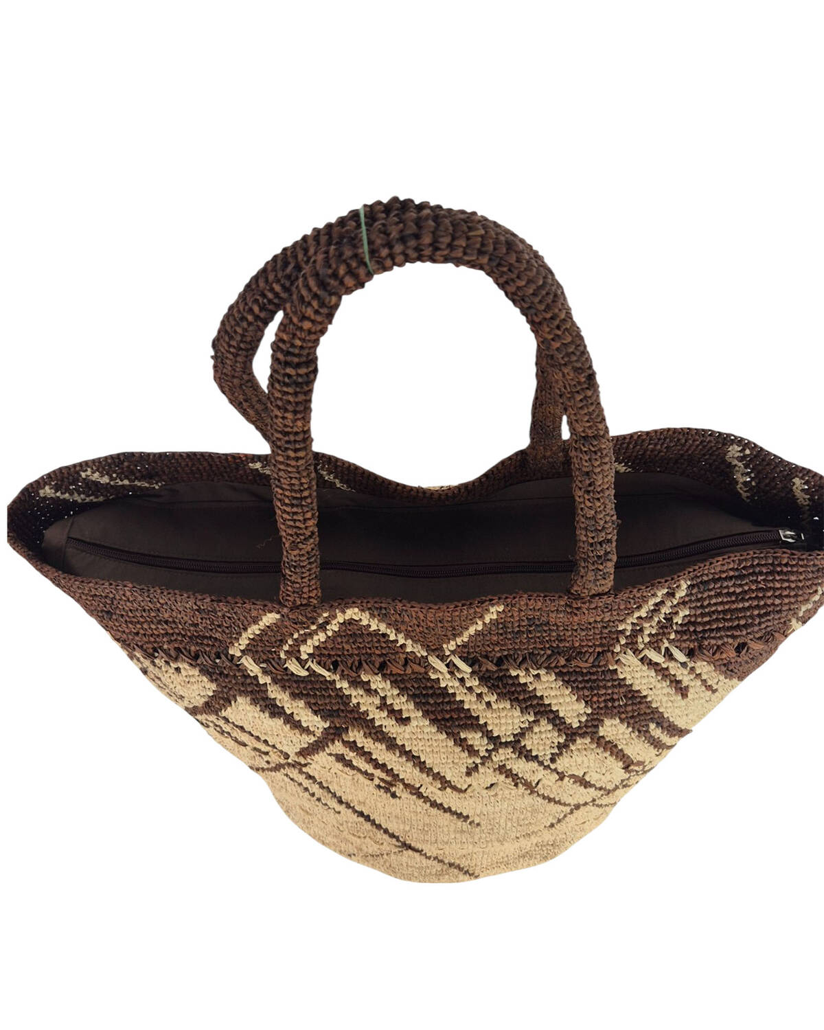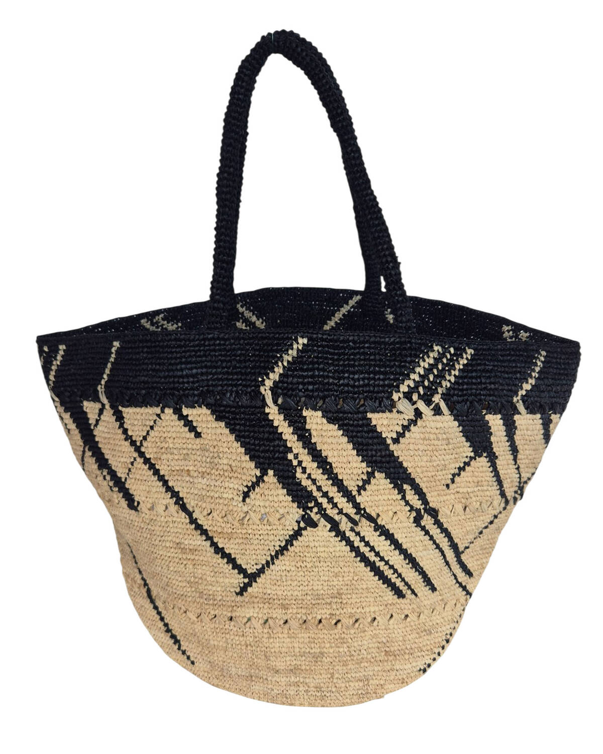Le sac BALIAKA est un sac à fond rond entièrement crocheté à la main avec des fibres naturelles de raphia.