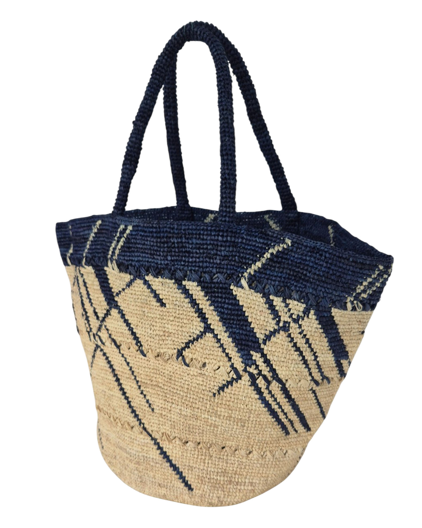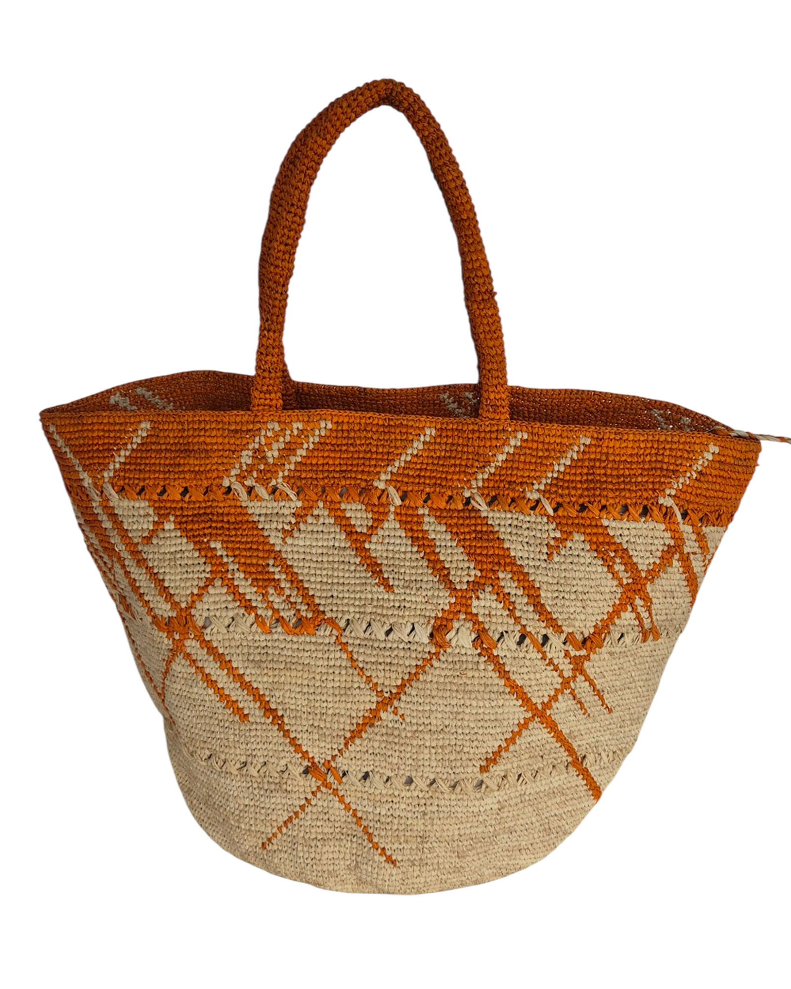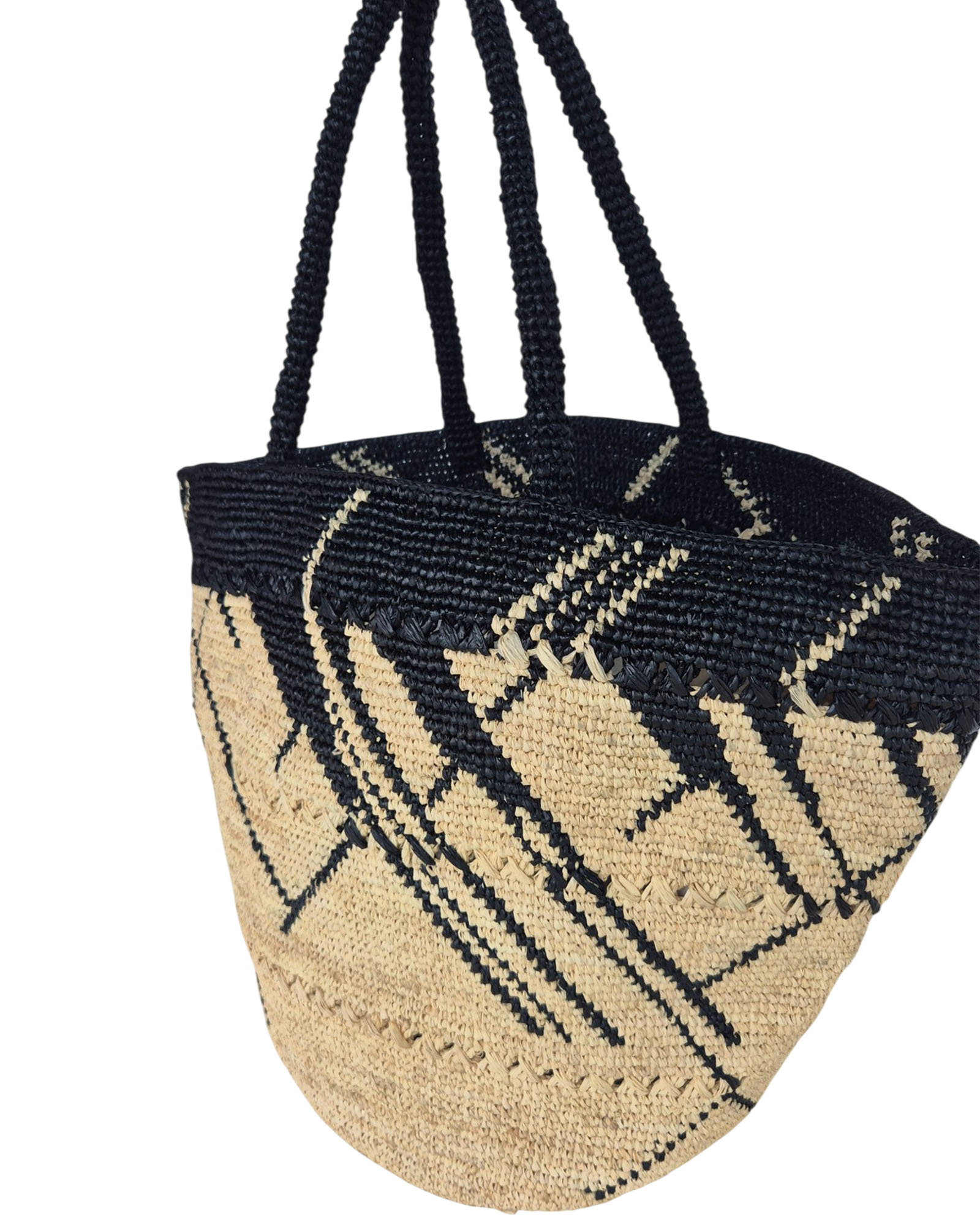 Le sac BALIAKA est un sac à fond rond entièrement crocheté à la main avec des fibres naturelles de raphia.