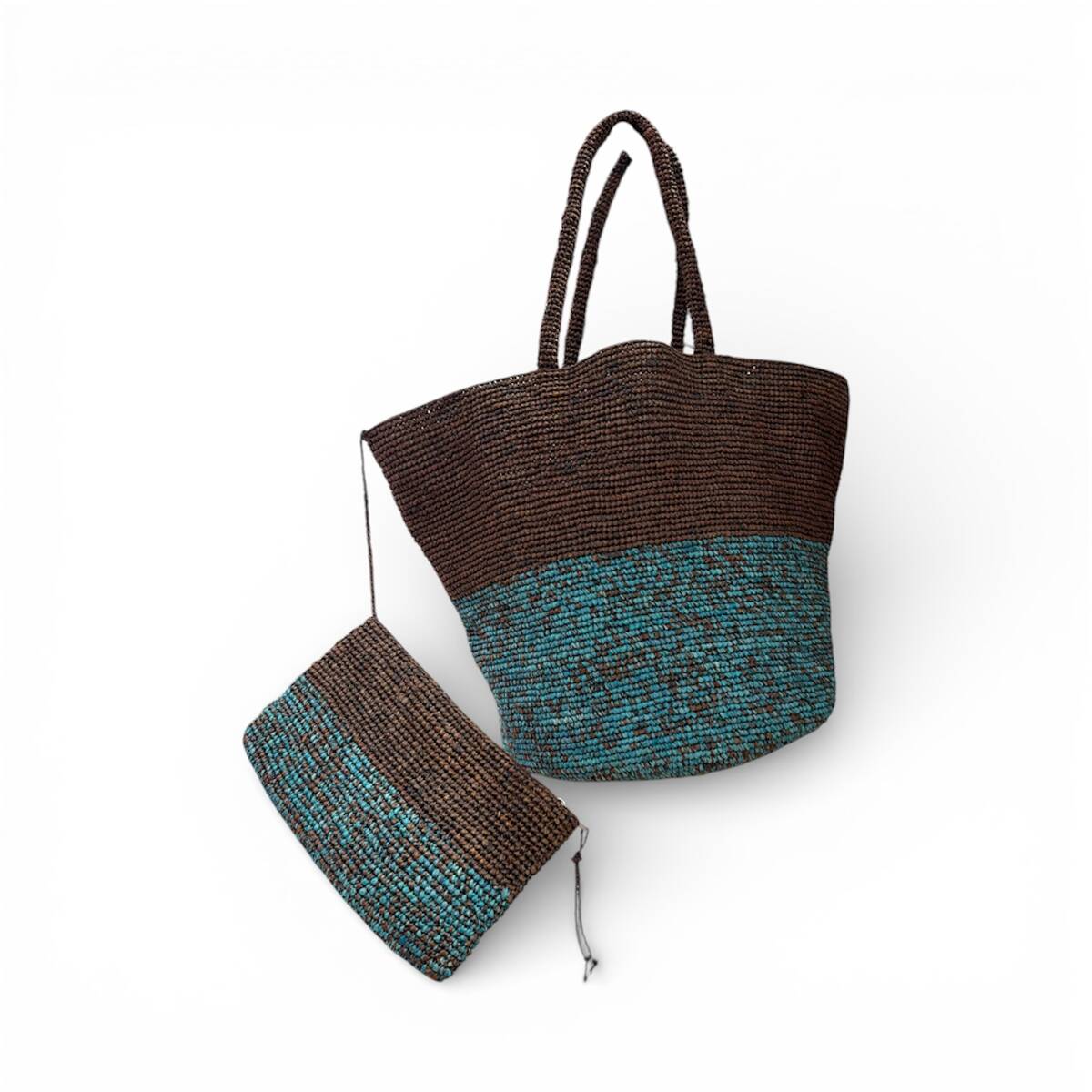 Le sac CAMILLA 2 Tons est un sac à fond rond entièrement crocheté à la main avec des fibres naturelles de raphia.