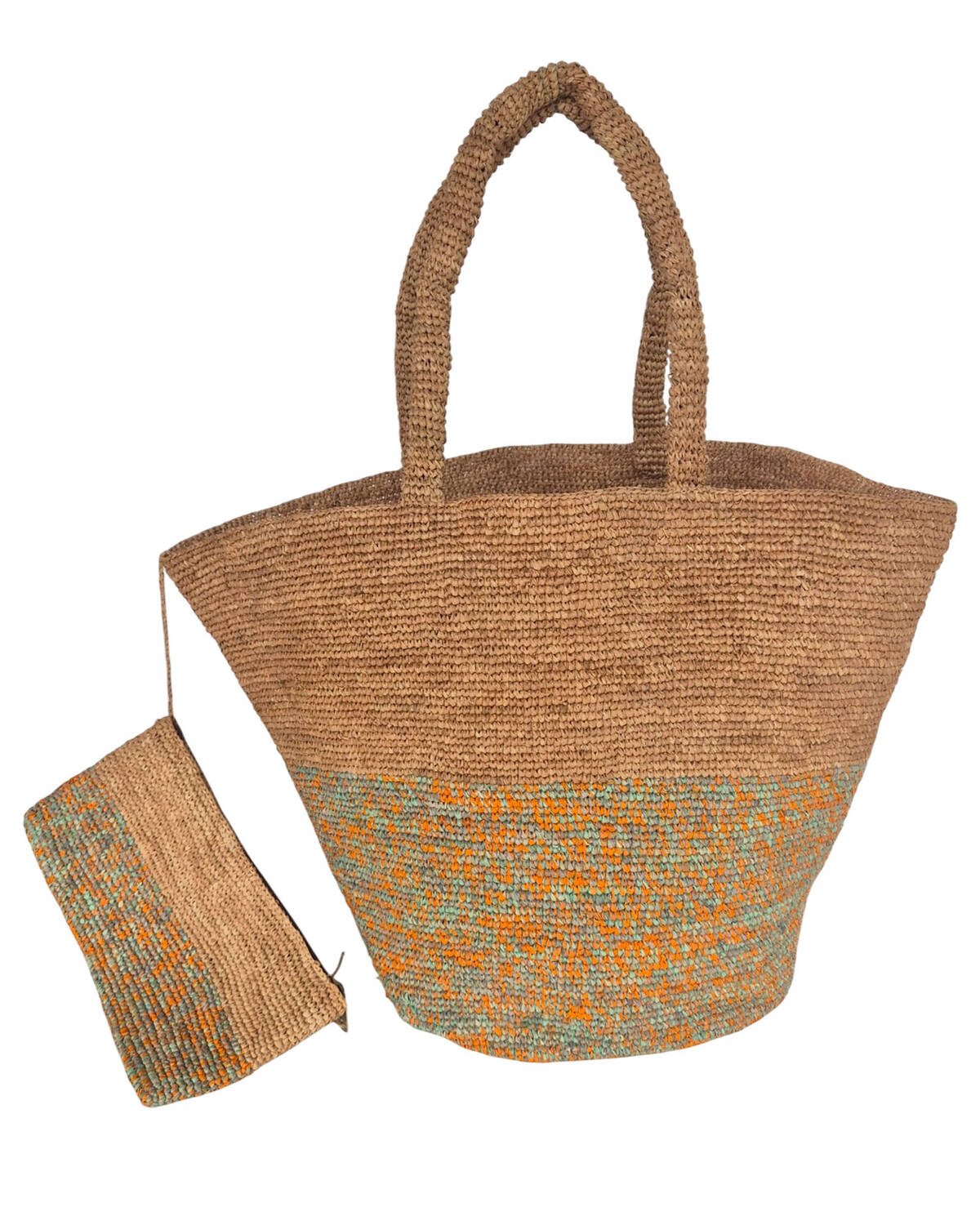 Le sac CAMILLA 2 Tons est un sac à fond rond entièrement crocheté à la main avec des fibres naturelles de raphia.