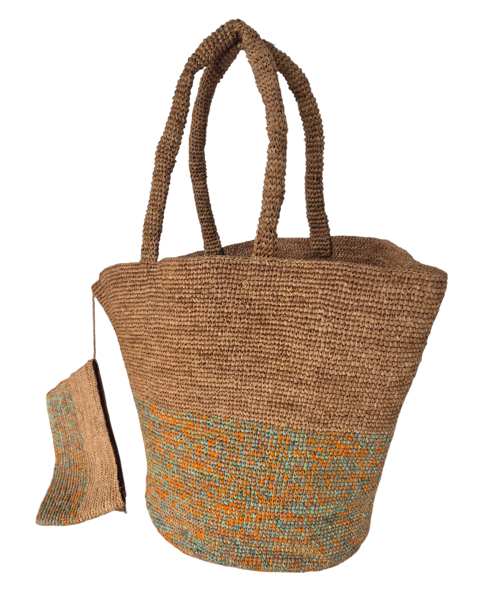 Le sac CAMILLA 2 Tons est un sac à fond rond entièrement crocheté à la main avec des fibres naturelles de raphia.